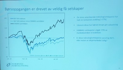 Covid 19 med børsbrillar på»: (Verdsindeksen) Frå topp til botn er det 34 % på 3 veker. Aldri hatt så stor nedgang (Må tilbake til 30 talet for å finne noko liknande). Om vi ser på kva som har skjedd etter den 23. mars så ser det ut som vi både har funnet ei vaksine, pandemien er over, vi har byrja å reise og bo på hotell, - skulle  man tru. Om vi ser på børs-bilete er vi tilbake der vi var på før vi visste noko om pandemien. Men vi veit at slik er det ikkje, - så om vi ikkje finn ei vaksine fort så kan det hende at vi har eit problem. Børsane er stort sett tilbake på same nivåa som før , unnateke Oslo børs , mykje pga. olja (ned 10 % enda). To av børsane i USA er på eit høgare nivå enn før pandemien slo inn. Børsane har tatt seg inn att i håp om at dette her skal ordne seg ganske fort. Dersom vi får ei vaksine i 4. kvartal er det ganske innafor. Det som eigentleg ligg i forventningane på børs er at vi er tilbake allereie neste år med den innteninga ein hadde i 2019. Så kan ein vurdere om det er realistisk eller ikkje. I prosent og kroner og øre så betyr det at vi skal ha ein vekst på 30 % neste år i selskapa si inntening om det her skal sjå greitt ut. No har det falle 30 %, så vi er tilbake til der vi kom i frå og spørsmålet er om vi klarer det i løpet av eitt år. Litt forskjellar mellom økonomiane, Europa er hardast ramme treng nesten  40 % auke.