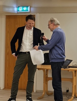 Som takk for foredraget fekk Ødegård Nilsen ei lita gåve frå klubben.