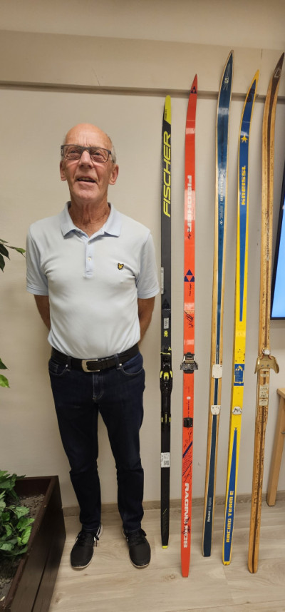 Velbrukte ski frå «stallen» til Audun Nerland. Frå høgre: Landsem treski 1968, Splitkein ski med epoxy-såle, Kneissl 1974: glassfiber-revolusjon!, Fischer,- gode ski.
