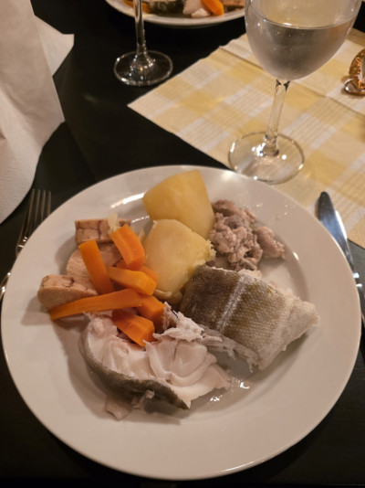 4) Torsk, rogn, lever, poteter, gulrot: heilnorsk tradisjonsmat av høgste klasse! Her kan underteikna referent lett bruke uttrykket om «å ete kroken av magen!» Rett nydeleg var det. Likevel: eg greidde å halde att eit lite volum til desserten: is med syltesaus (?) All ære til – som nemnt ovanfor: førsteklasses kokk og medhjelparar.