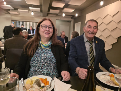 2) Programmet, kort info ved Presidenten: torskemiddag med lever og rogn, og med førsteklasses kokk og medhjelparar. Friviljuge hjelparar frå Rotaryklubben fekk også applaus. Ordførar i Stranda frå 2023, og klubbmedlem Einar Arve Nordang ville informere om kommunen. Men aller først…